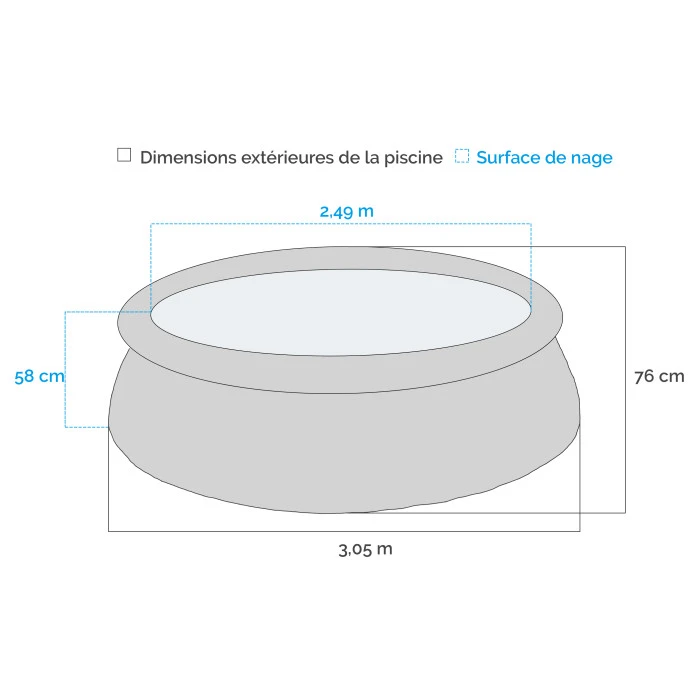 Pour cette piscine, nous vous conseillons de monter cette piscine à 2 personnes. Vous serez surpris qu’en seulement 10 minutes, votre piscine sera entièrement montée. Il vous suffira ensuite de remplir votre piscine d’eau !