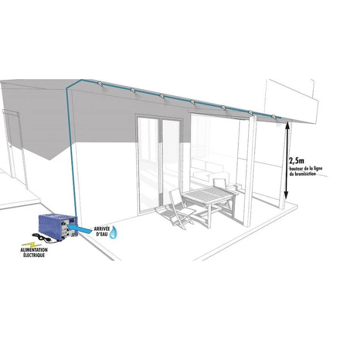 Ce système se démarque des autres brumisateurs de terrasse par la mise sous haute pression de l’eau, environ 60 bars. À l’aide des buses, de très fines gouttelettes s’échappent et s’évaporent rapidement au contact de l’air. Celui-ci est ainsi rafraîchit mais l’eau projetée ne mouille pas grâce à une transformation en très petites gouttes.